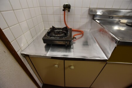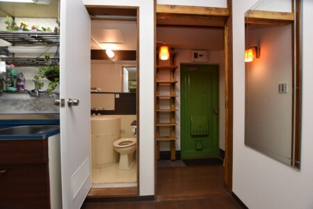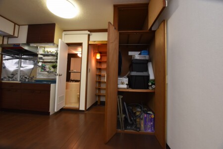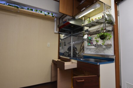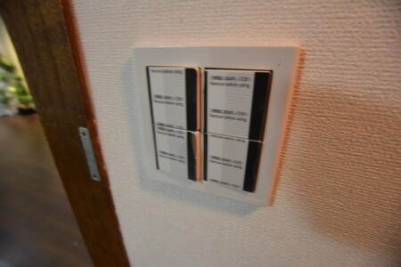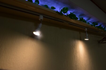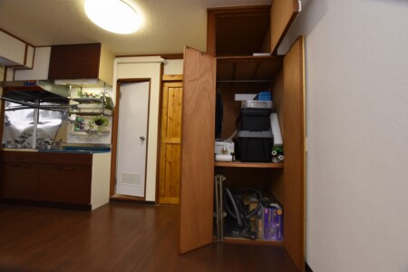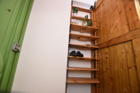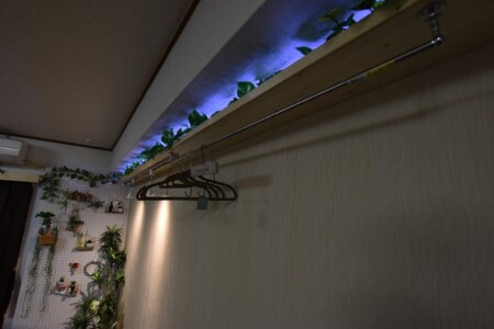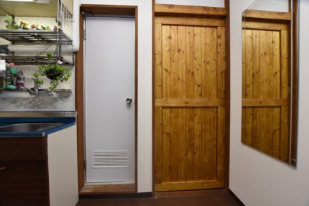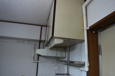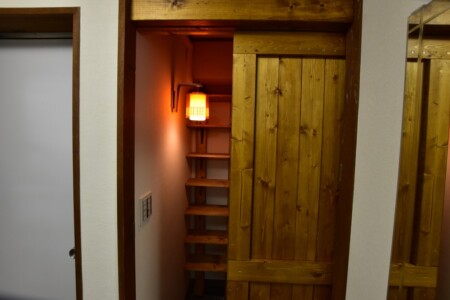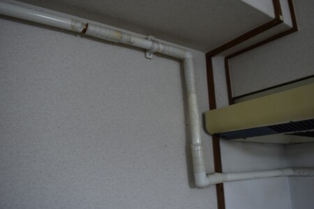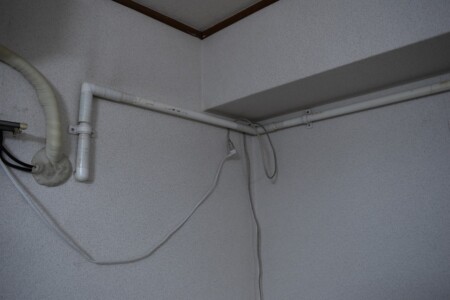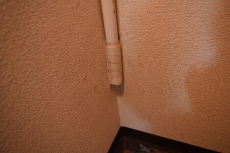 この部屋は電気給湯機があります。後付けの為、その配管は室内を張り巡らされています。これを隠すのに苦労しました。