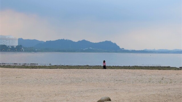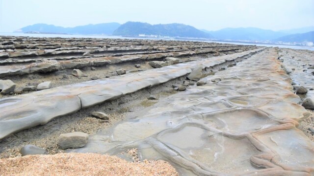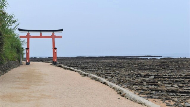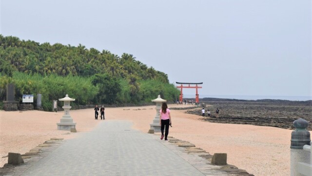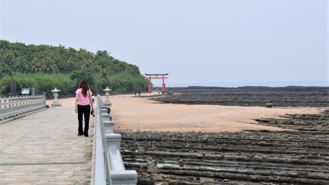 海岸から延びる青島へ続く橋を渡ると、鳥居へ続く道の横に大きな「鬼の洗濯板」が広がる海岸が現れます。砂浜は、貝殻が砕けて出来ている白ピンク色で、きっとココでしか見れないであろう、とても綺麗な風景でした。