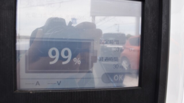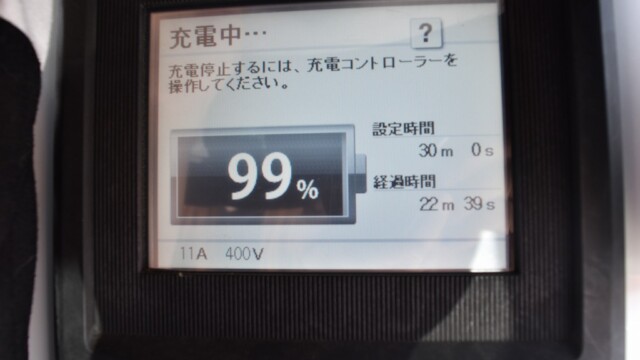 注目すべきは、開始時の出力が104A(387V)で22分39秒時点では11A(400V)ですが、この時点で99%になっています。それなのに30分までかかって99%のままという事は以前の記事でも紹介している通り、実用的な事を考えれば急速の場合、80%~90%の辺りで止める方が良さそうです。