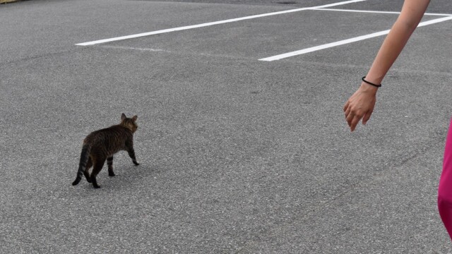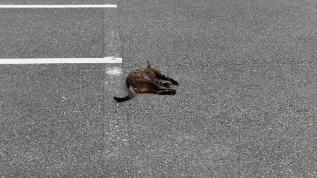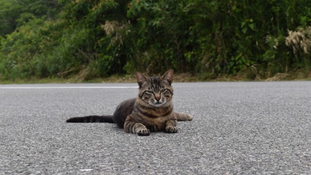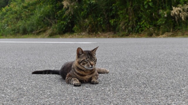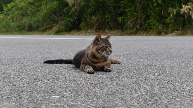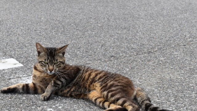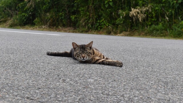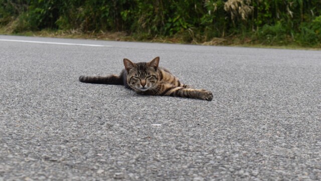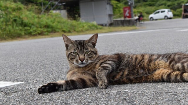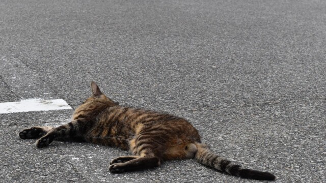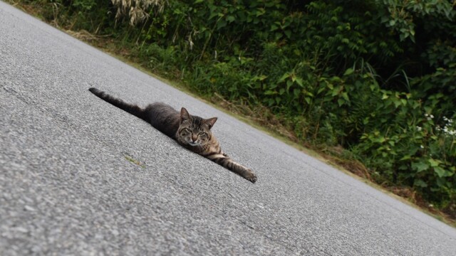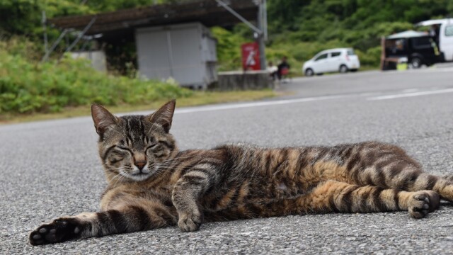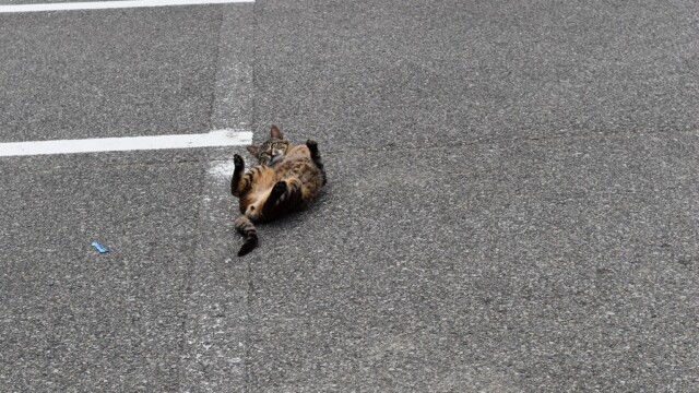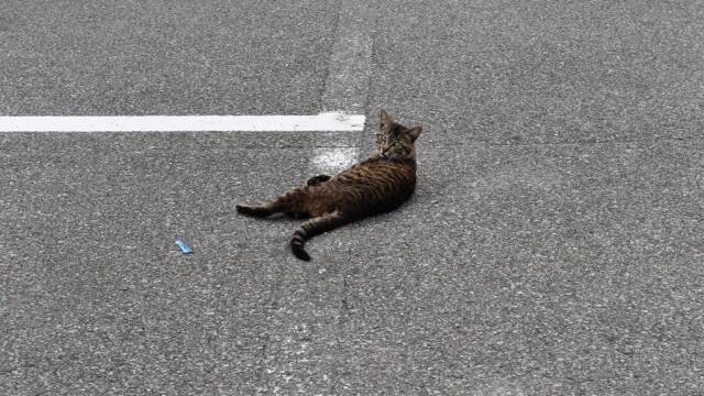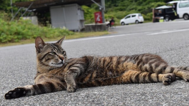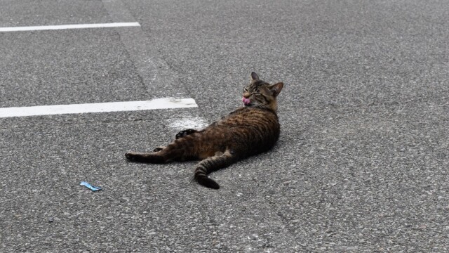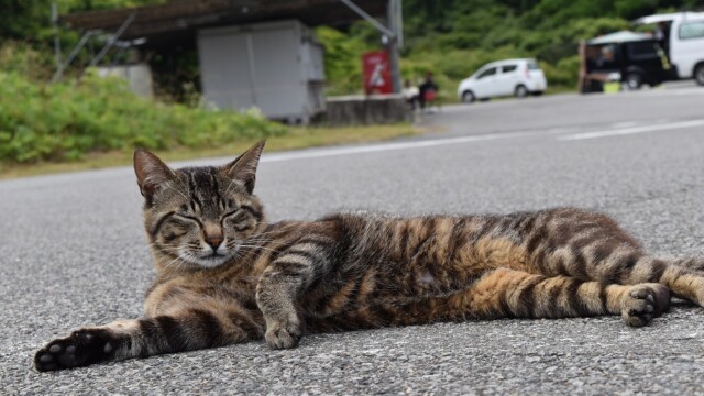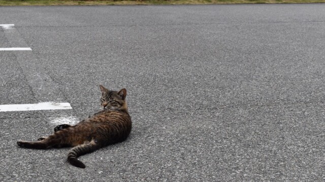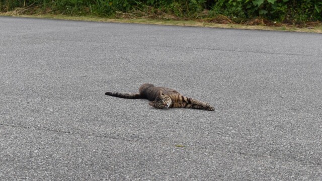 さて次の目的地に出発っと、ん? 駐車場のど真ん中でゴロンと寝っ転がっている猫ちゃんが♪ あまりにカワイイんで写真をパチリ。
