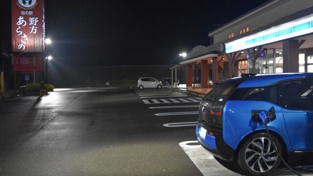 無料で充電できる「道の駅 野方あらさ」に到着しました。レンジエクステンダーで走った距離は15kmほどなので、ほとんどガソリン減っていません。早速充電開始。