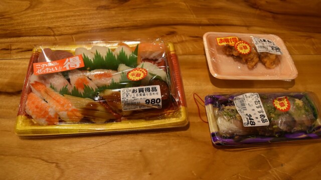 ちなみ晩御飯は日南で買った半額お寿司です。やっぱ海の街でかったお寿司はスーパーの物でも美味しいですね。これで半額なら大満足です。