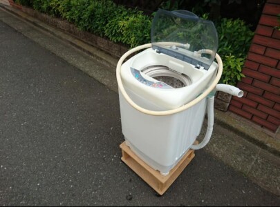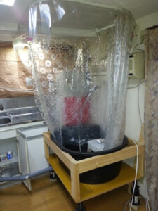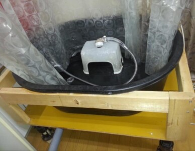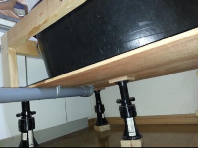 ちょっと恥ずかしいですが、カーテンすら買わずに運送業で使う梱包材を代用してます。そしてお風呂がないので銭湯(品川の黒湯)によく2人で行ってましたが、ずっとそんな事してたらお金かかって仕方ないので、DIYでシャワー室を自作しました(笑)。庭の池用の大きな容器を台所に設置し、2×4材の下駄をはかせて、排水は台所の排水管と合流させます。場所が狭く洗濯機が邪魔だったので、移動式の台を作って使う時だけ台所まで転がし、お風呂と排水溝を切り替えて使用していました(笑)。