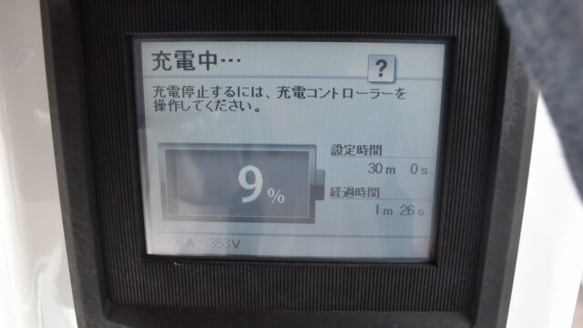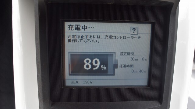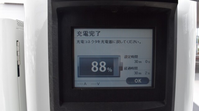 今回、御貸し頂いた福岡日産 福岡空港前店のディーラーに確認したところ「30kWh」モデルだとの事です。充電場所は宮崎の「日産 延岡南店」で、測定の為に100%になるまで充電しました。
