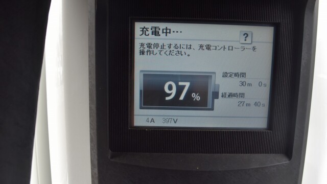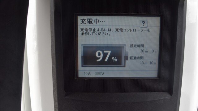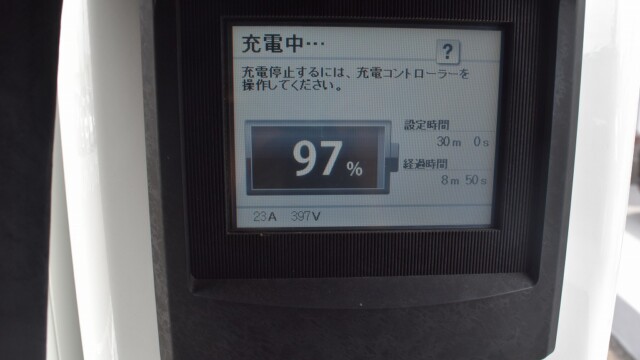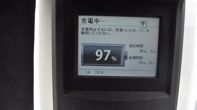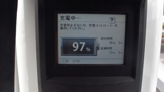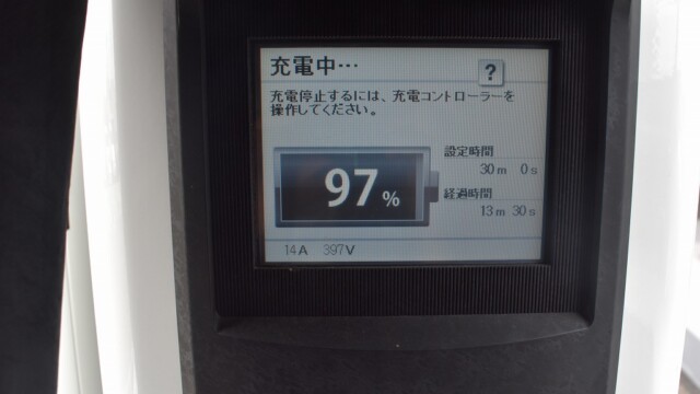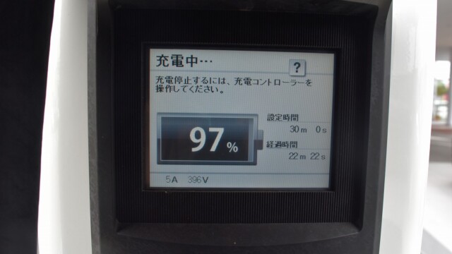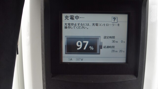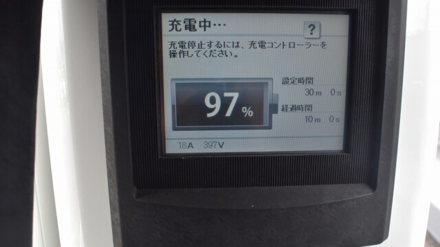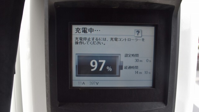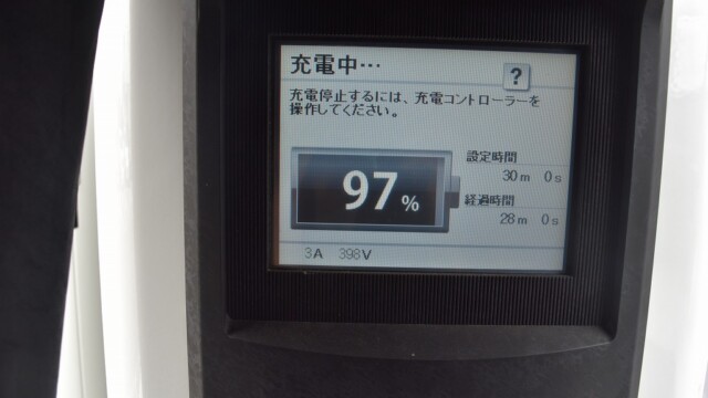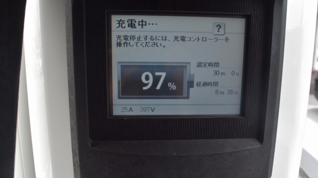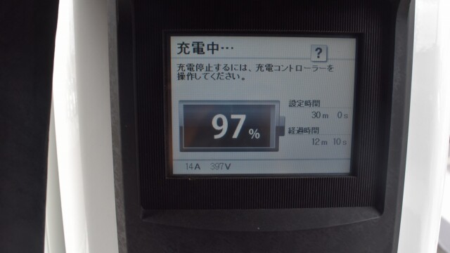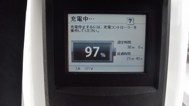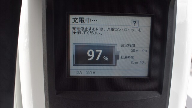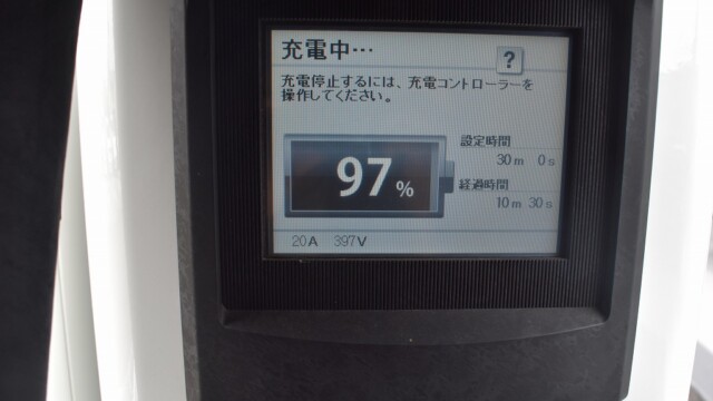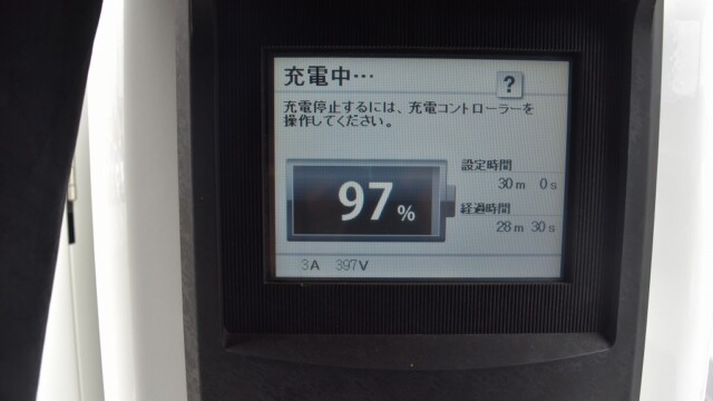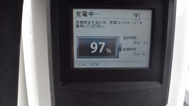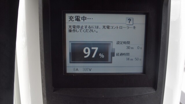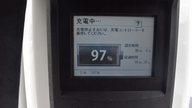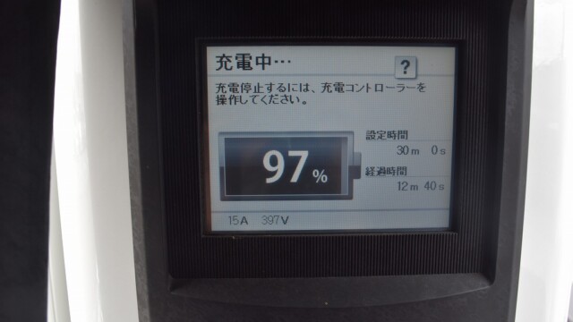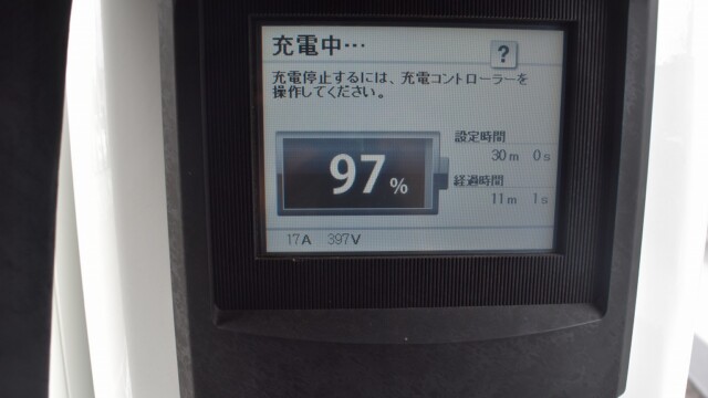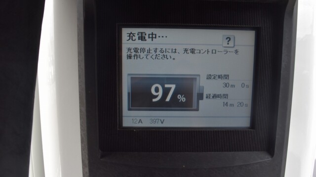 なので、充電速度も遅い(200V 10Aの普通充電以下)ので97%の状態のまま増えません。もしかしたらリーフは、急速でコレ以上充電しても意味が無い状態で30分たったら、100%として丸めてしまうのかもしれませんね。