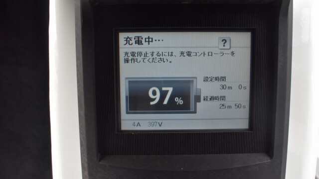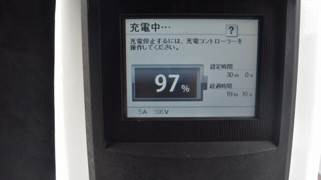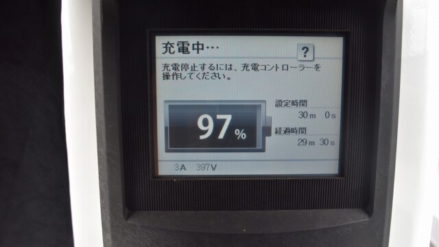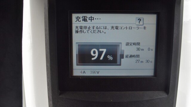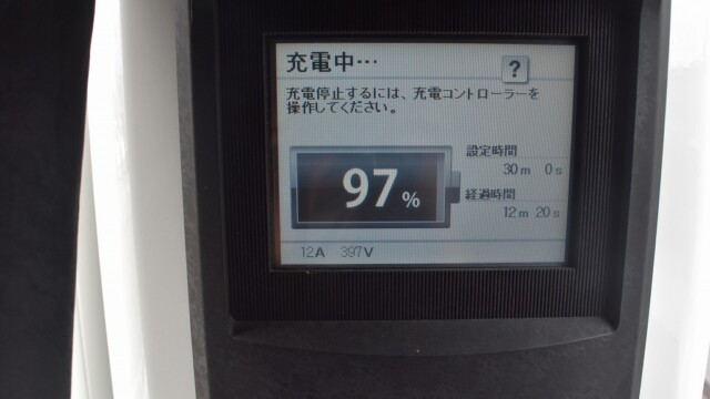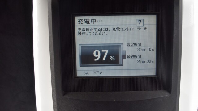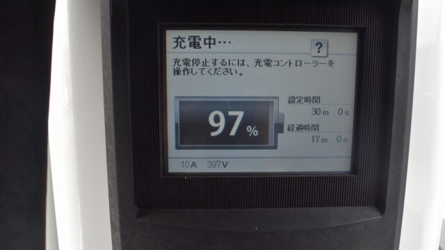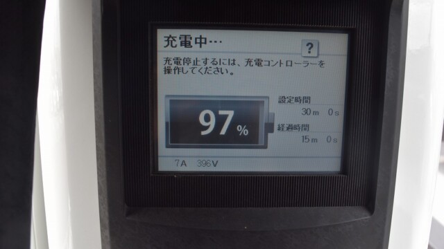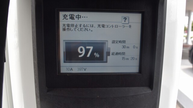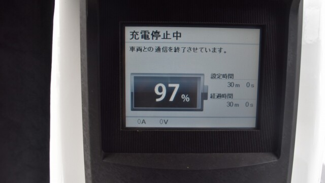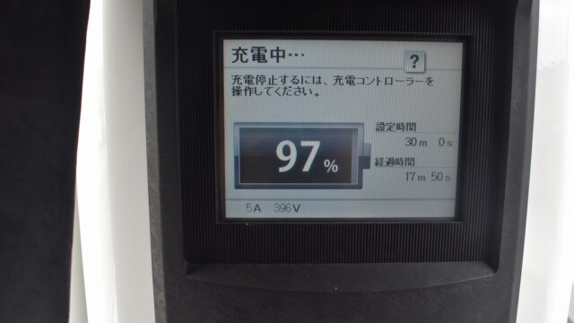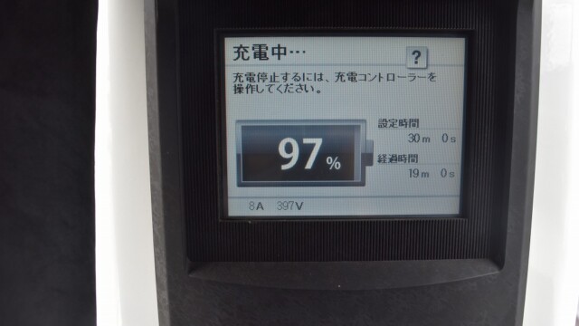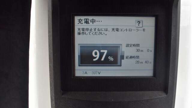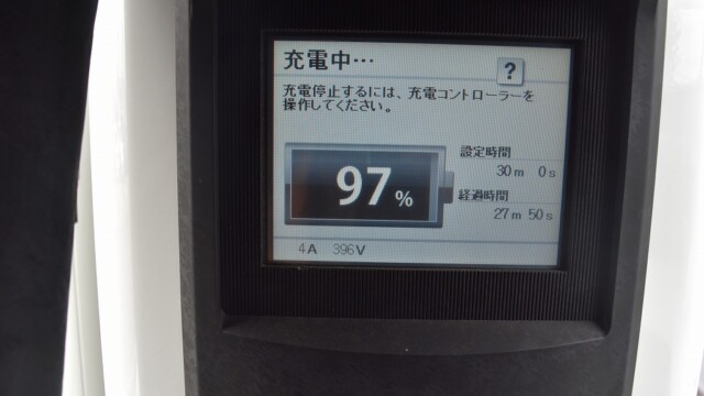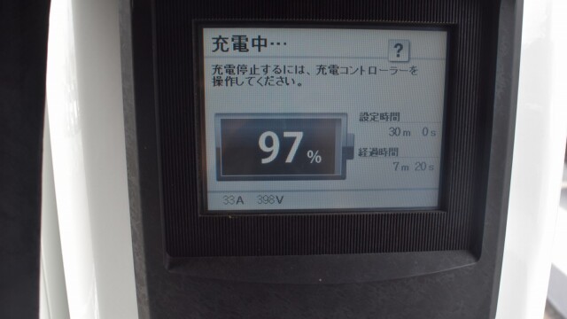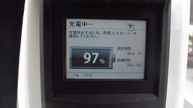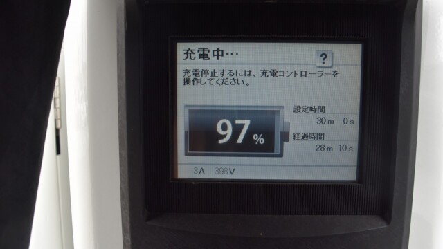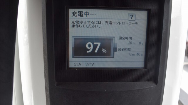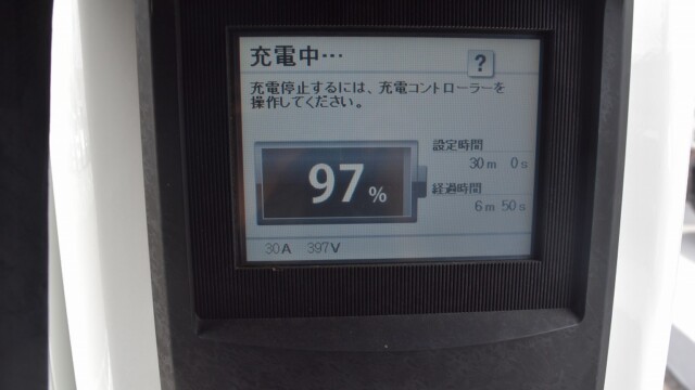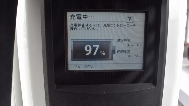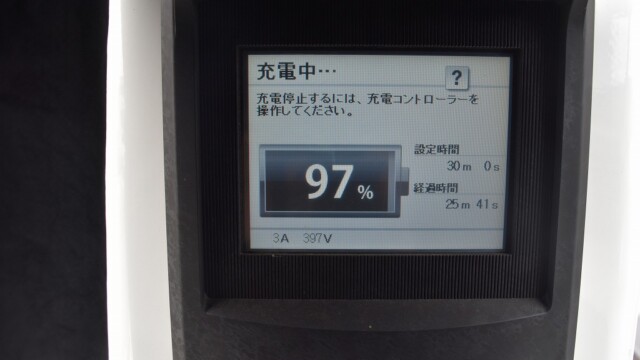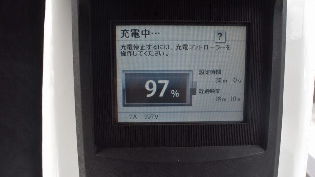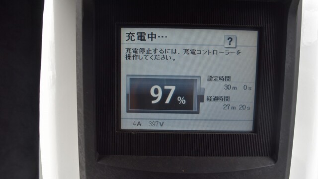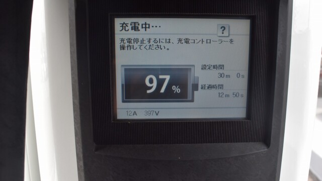 なので、充電速度も遅い(200V 10Aの普通充電以下)ので97%の状態のまま増えません。もしかしたらリーフは、急速でコレ以上充電しても意味が無い状態で30分たったら、100%として丸めてしまうのかもしれませんね。