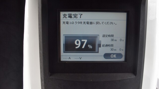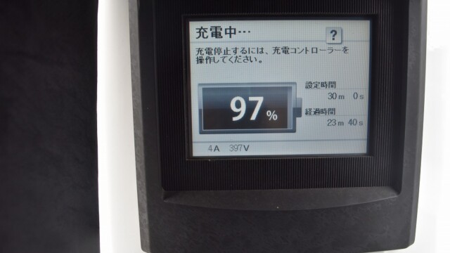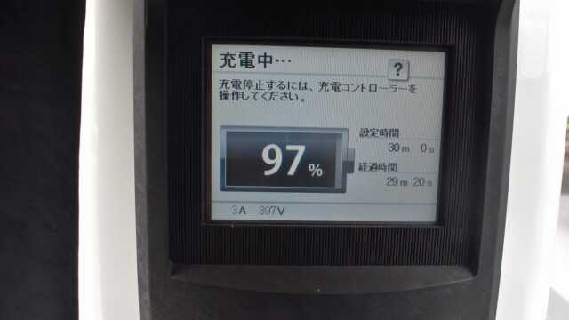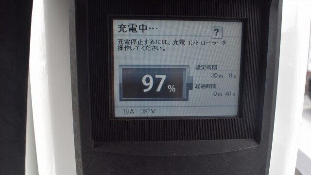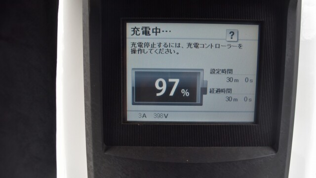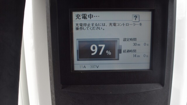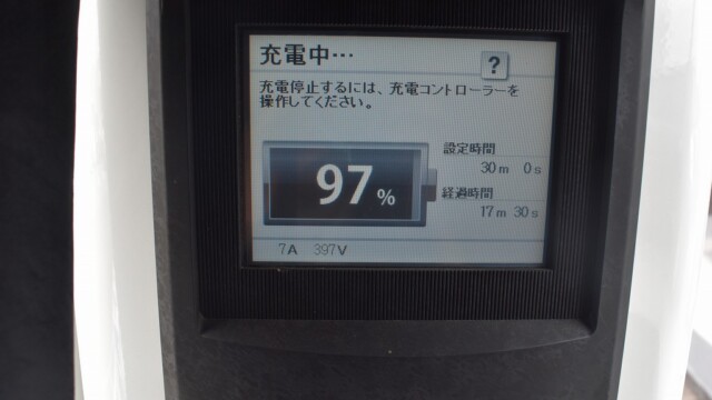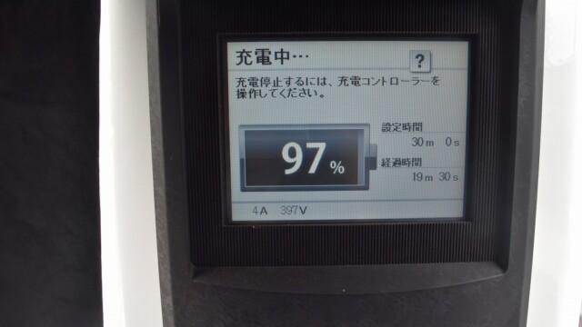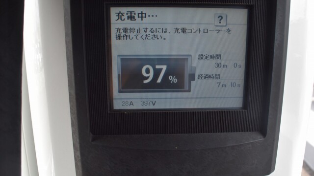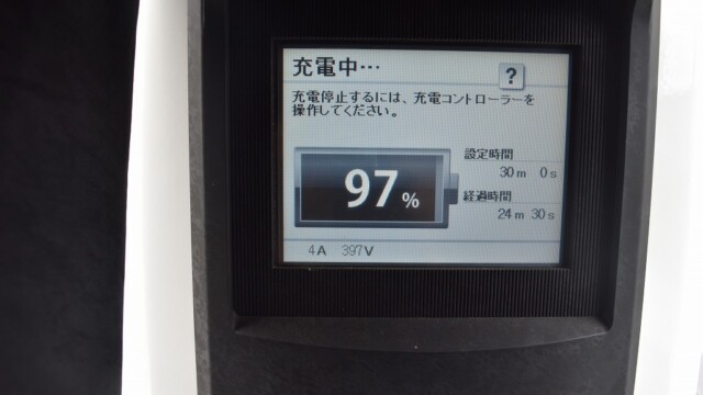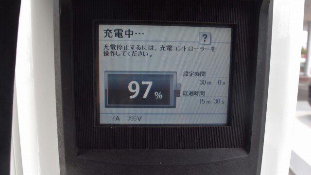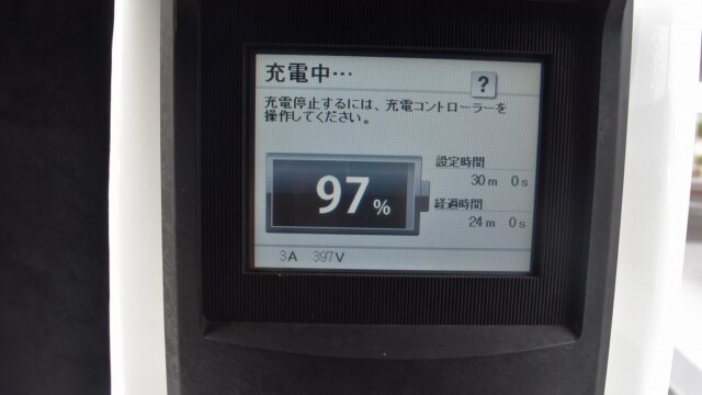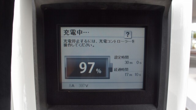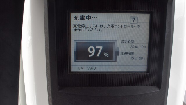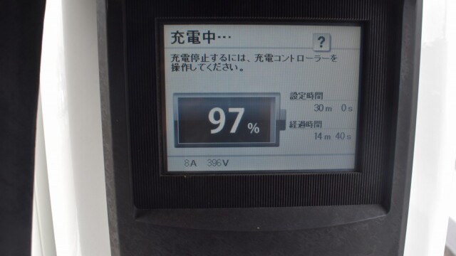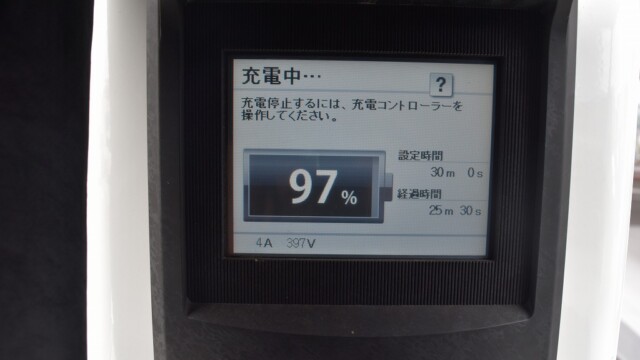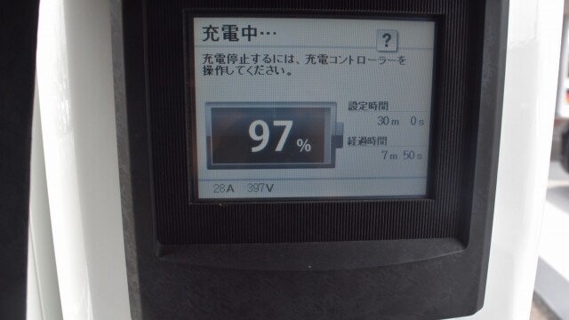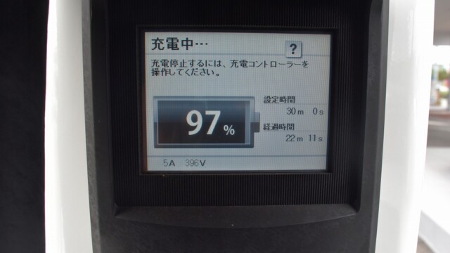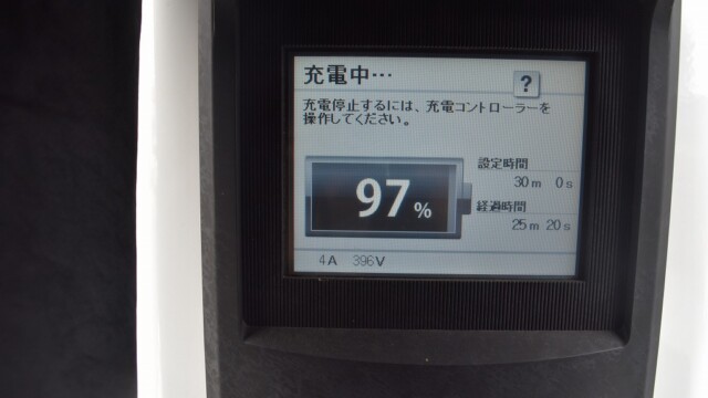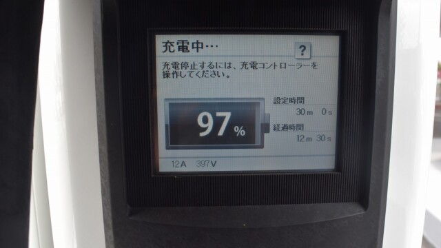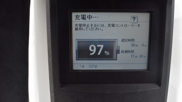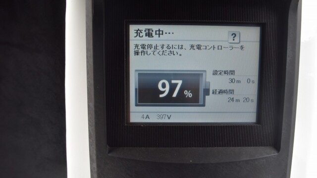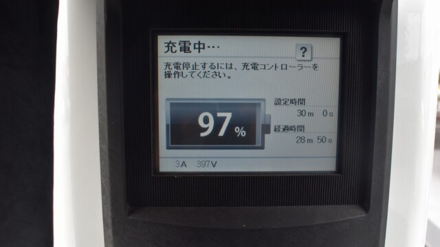 なので、充電速度も遅い(200V 10Aの普通充電以下)ので97%の状態のまま増えません。もしかしたらリーフは、急速でコレ以上充電しても意味が無い状態で30分たったら、100%として丸めてしまうのかもしれませんね。