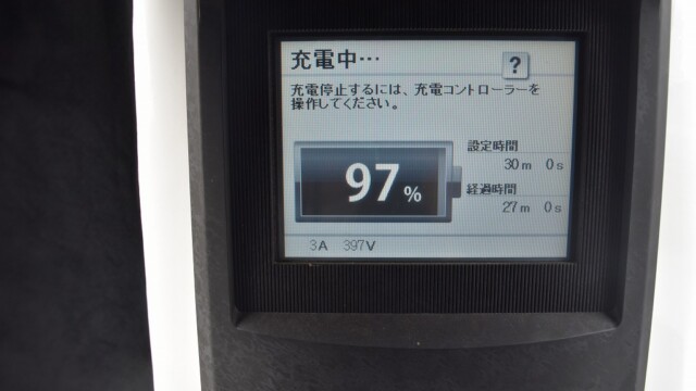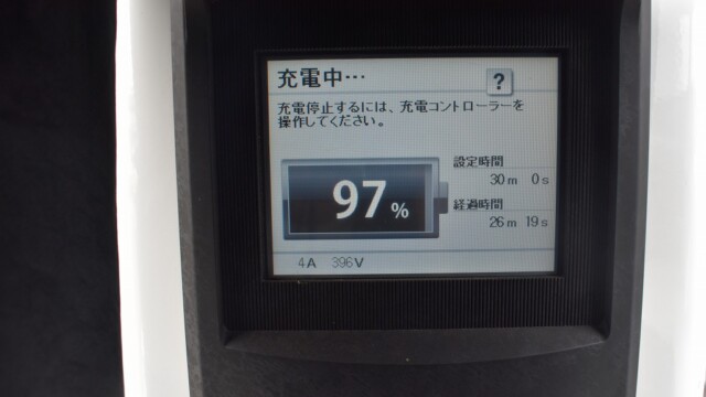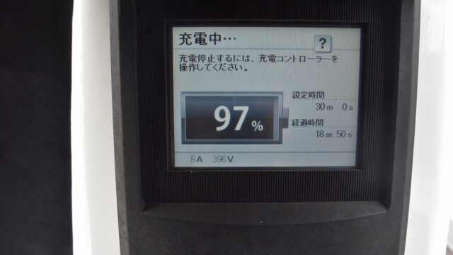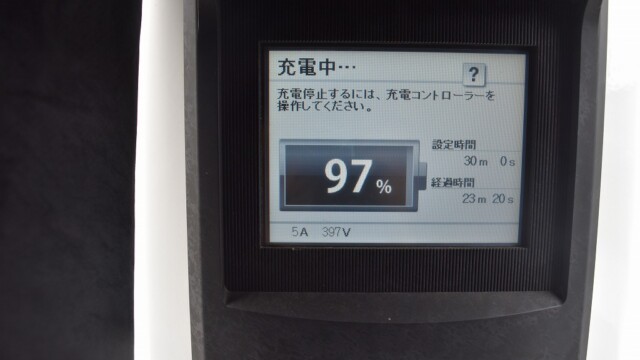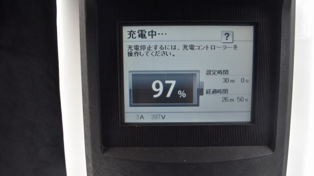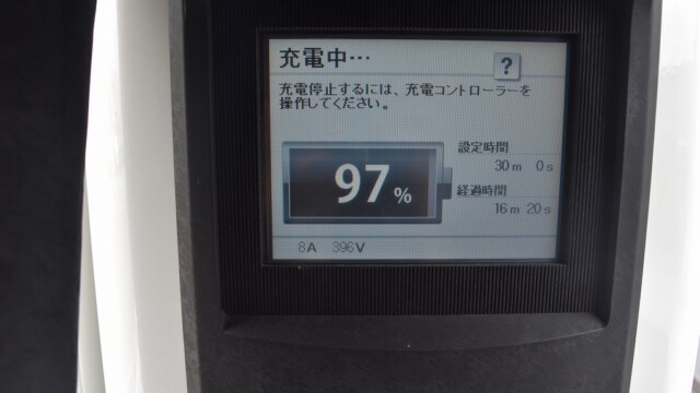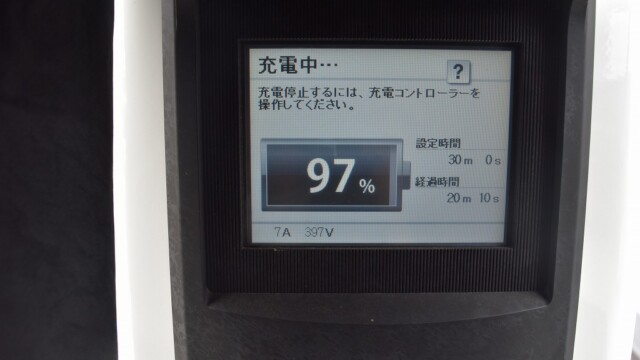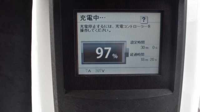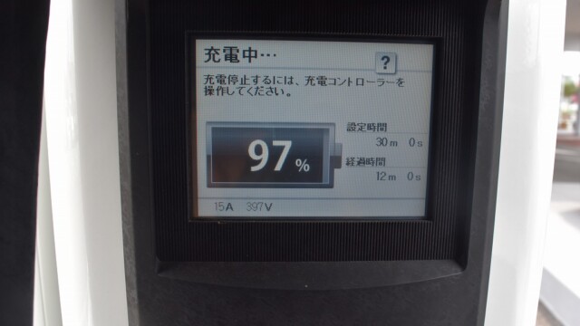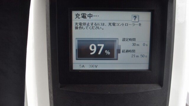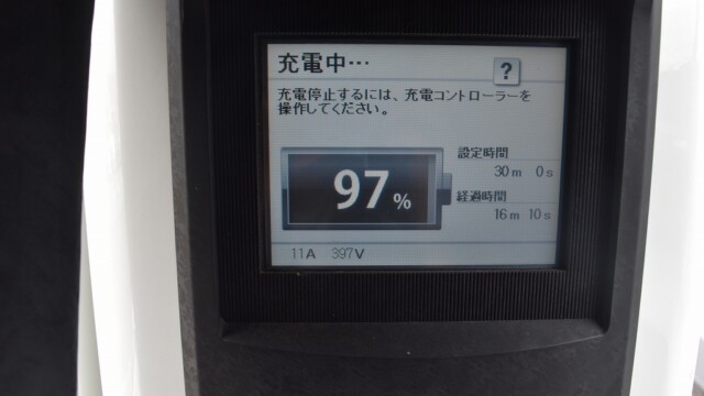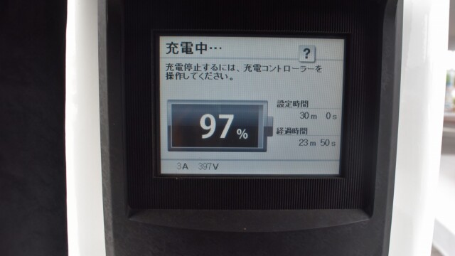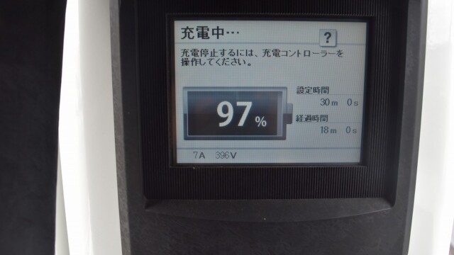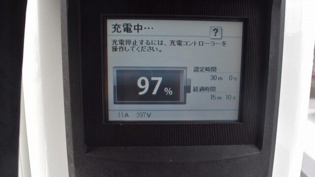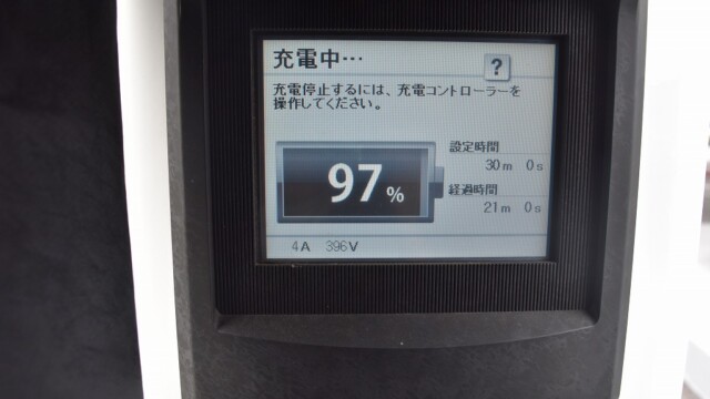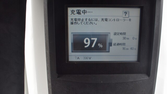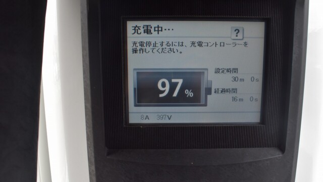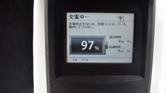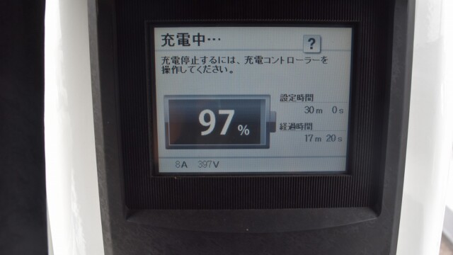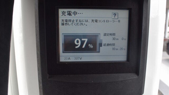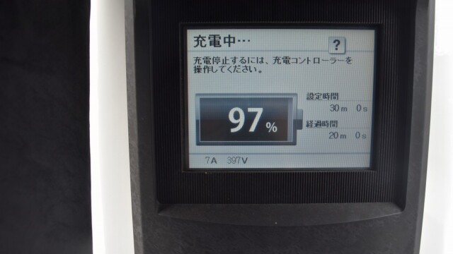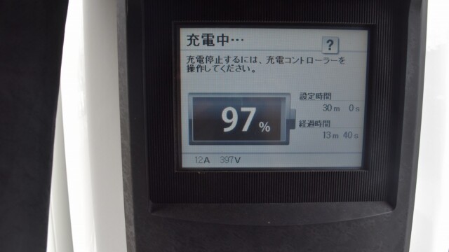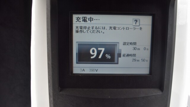 なので、充電速度も遅い(200V 10Aの普通充電以下)ので97%の状態のまま増えません。もしかしたらリーフは、急速でコレ以上充電しても意味が無い状態で30分たったら、100%として丸めてしまうのかもしれませんね。