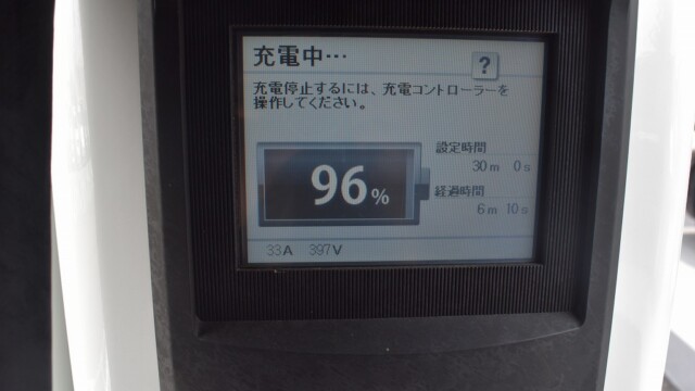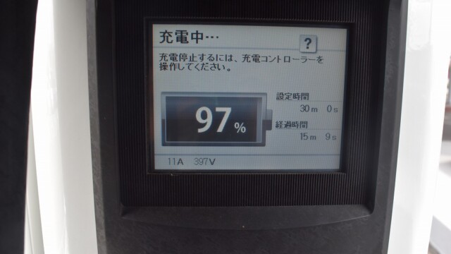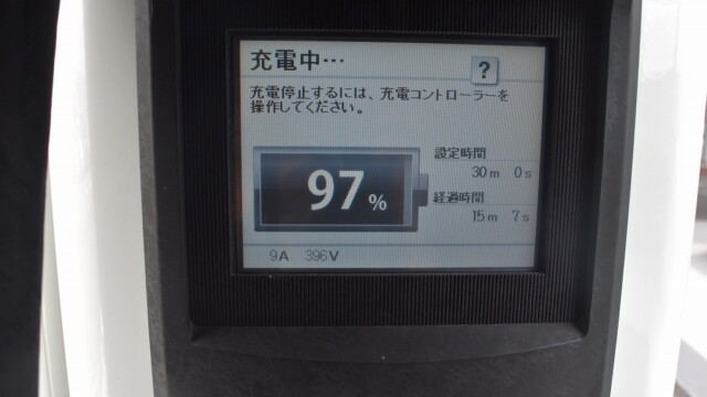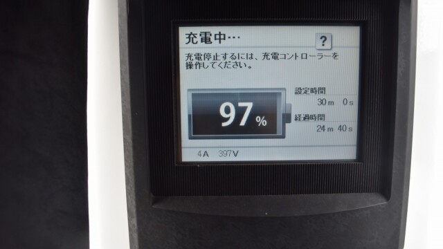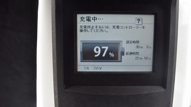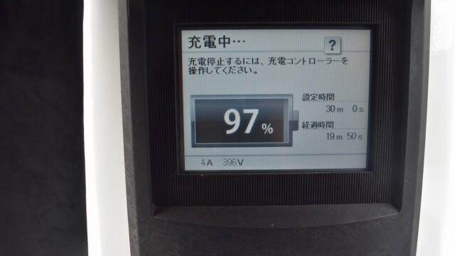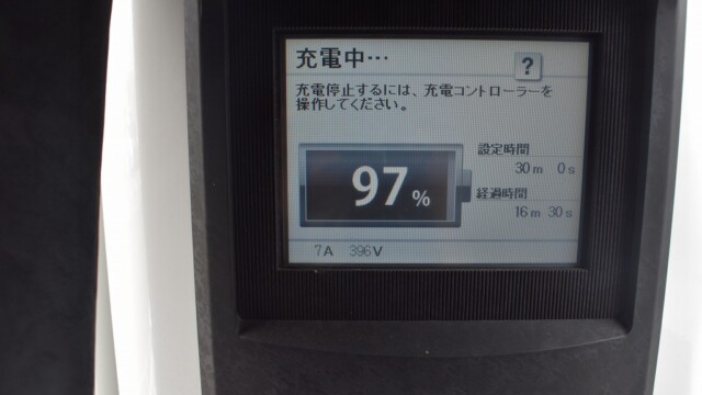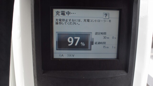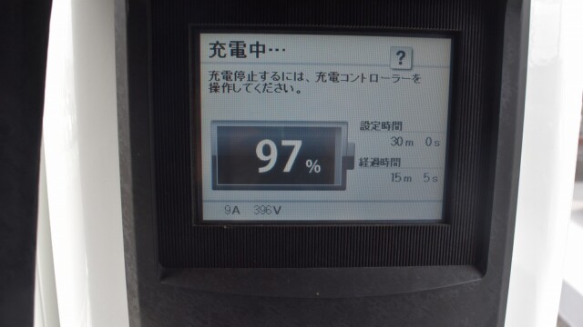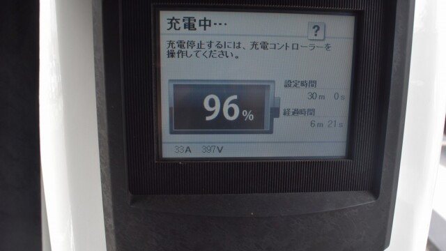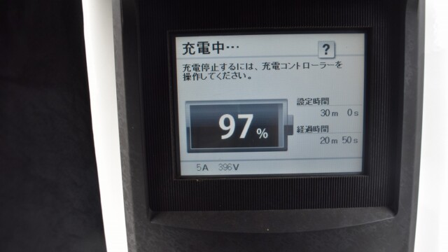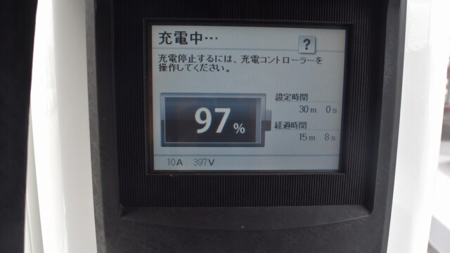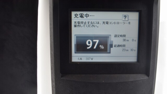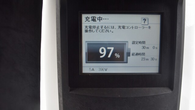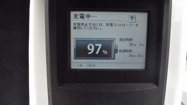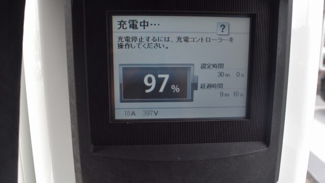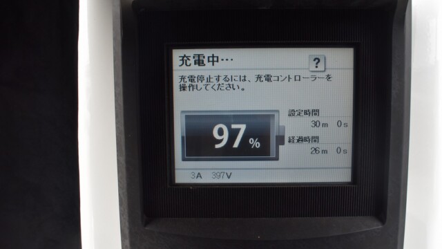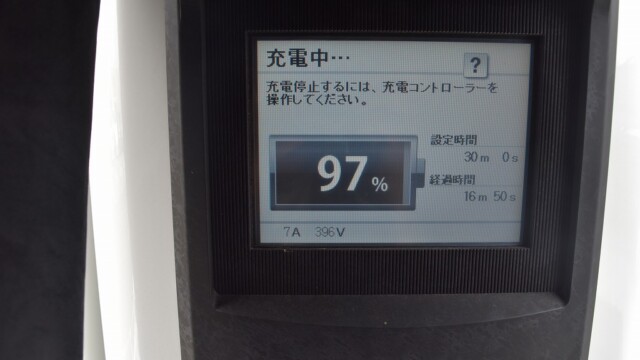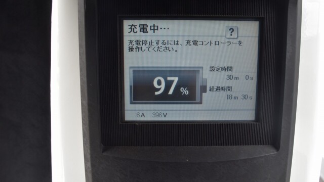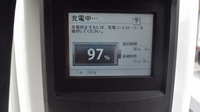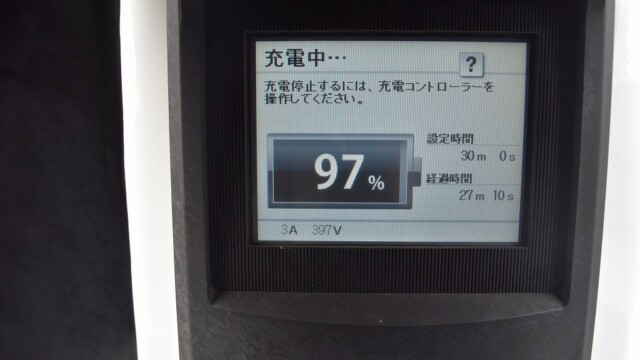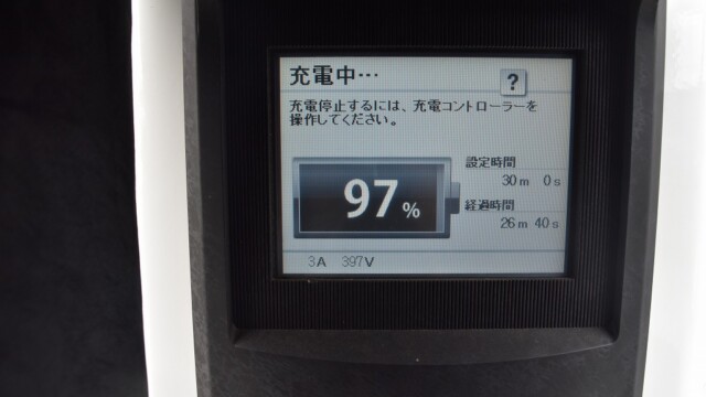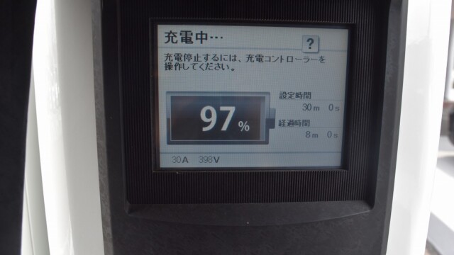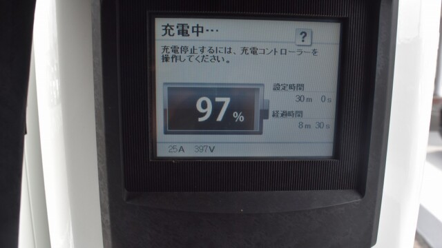 なので、充電速度も遅い(200V 10Aの普通充電以下)ので97%の状態のまま増えません。もしかしたらリーフは、急速でコレ以上充電しても意味が無い状態で30分たったら、100%として丸めてしまうのかもしれませんね。