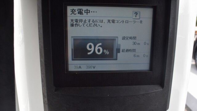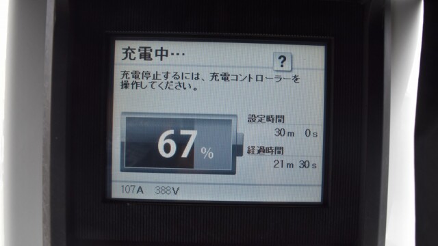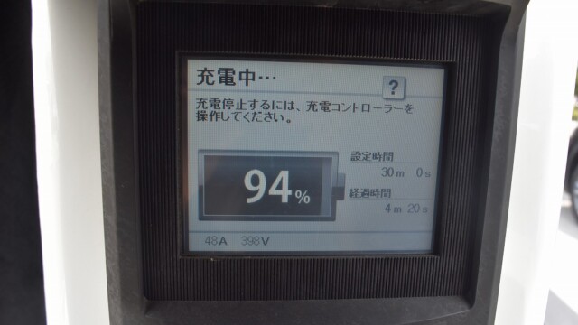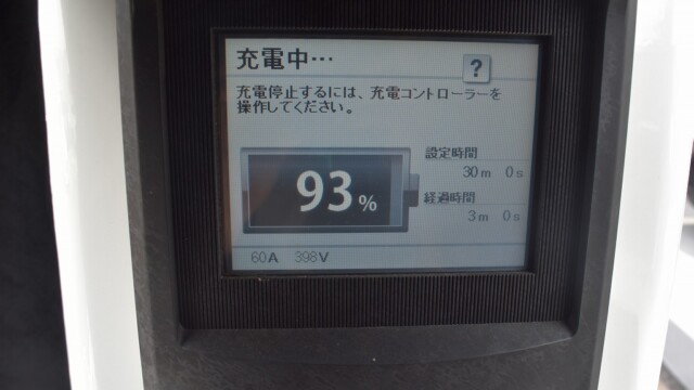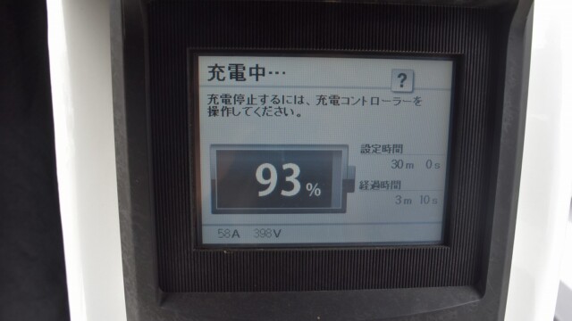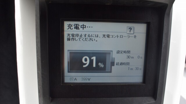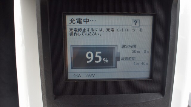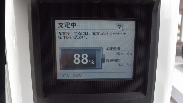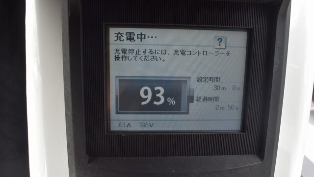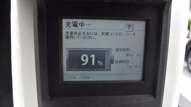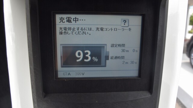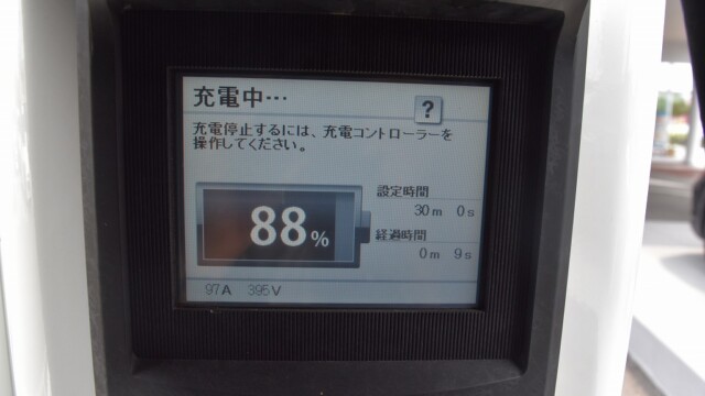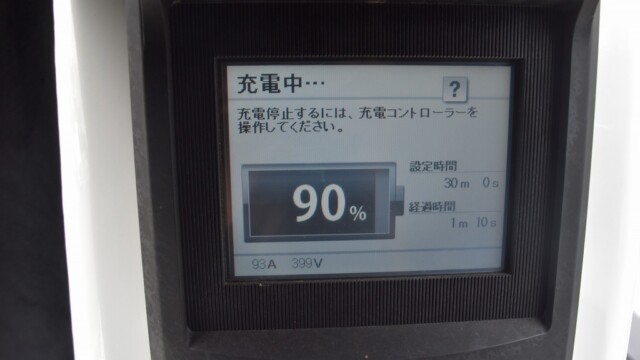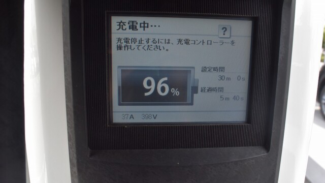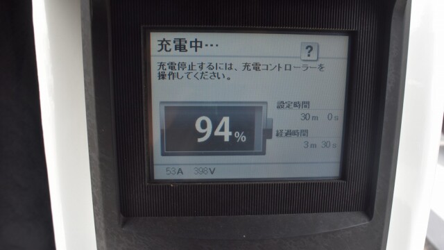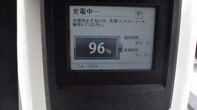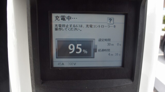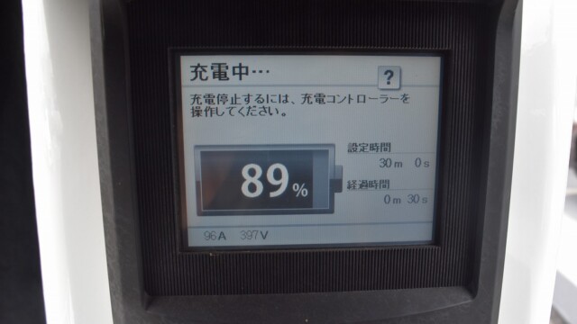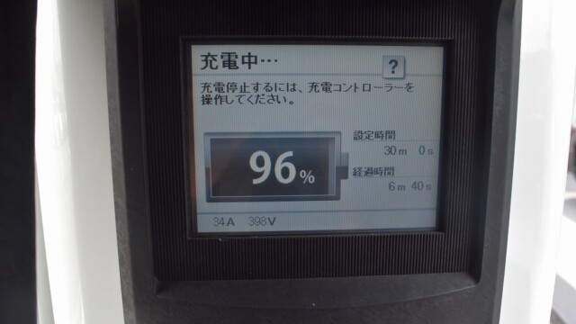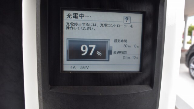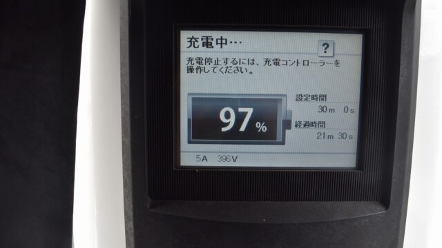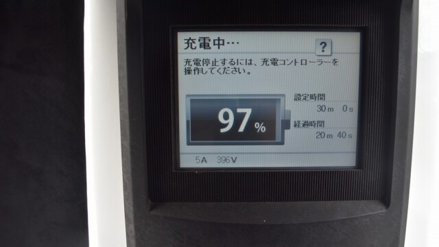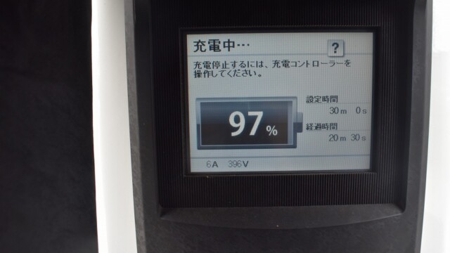 なので、充電速度も遅い(200V 10Aの普通充電以下)ので97%の状態のまま増えません。もしかしたらリーフは、急速でコレ以上充電しても意味が無い状態で30分たったら、100%として丸めてしまうのかもしれませんね。