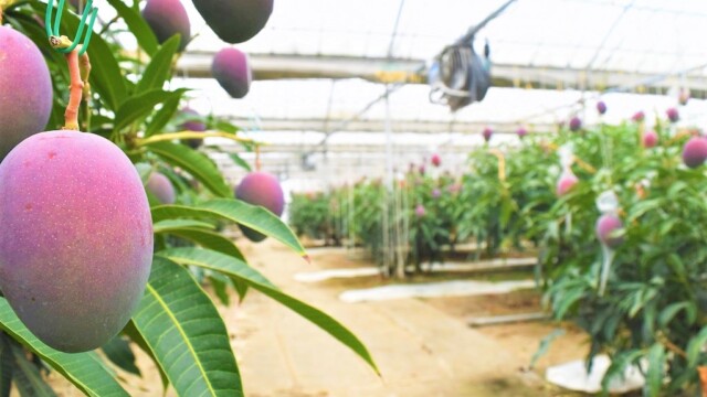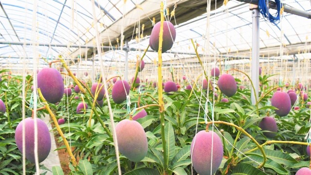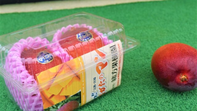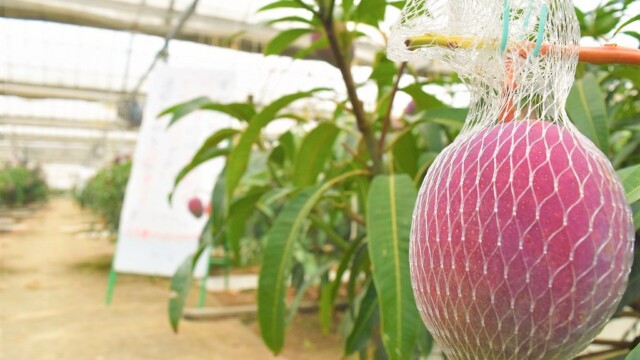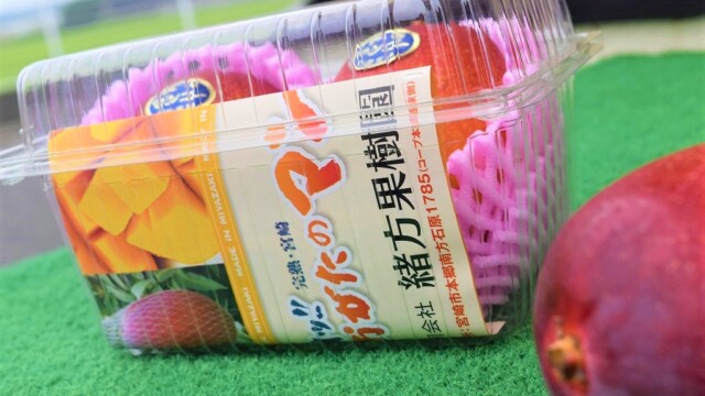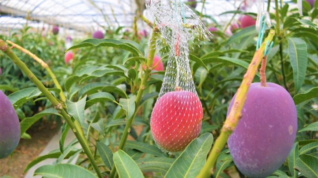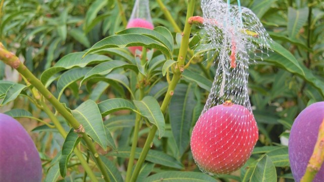 宮崎の完熟マンゴーって、熟してくると1つづつこんな風にネットを付けます。そして熟して自然と網の中に落ちたものだけを出荷する。まさに「完熟」という名前の通りですね。
