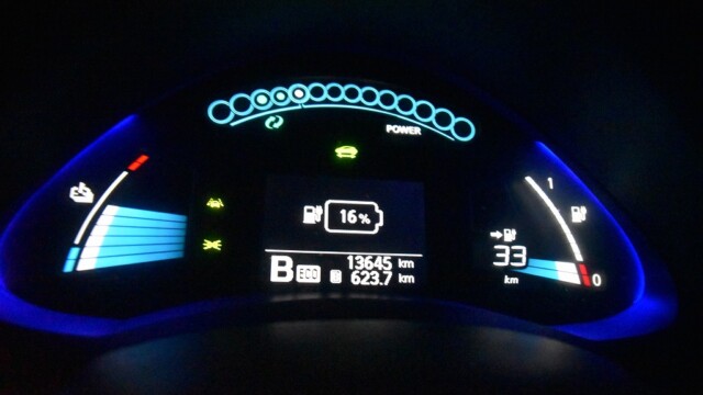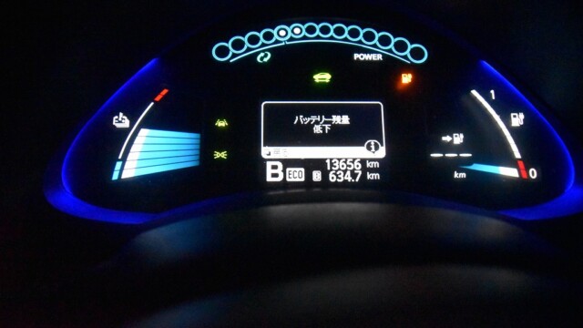 前日はギリギリまでバッテリーを使い切りました。ガソリンマークの下、走行可能距離が「—」(通称ヘビ)になっていますね。