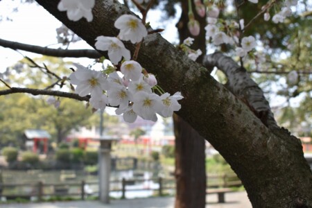 ヤシの木が生えている所も南国っぽくて良いですね♪池の周りを散策します。少しだけサクラが咲いています。