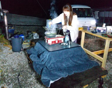 電気自動車やオフグリッド発電で電気に困る事が無い我が家、今日は青空こたつでキャンプしました♪ だいぶ収まってきたけど、夜はまだまだ寒いからねw。もつ鍋ウマー(#^^#) こたつあったかーぃ♪