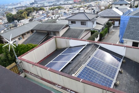 他の構成も簡単に説明しておきます。まずパネルは「ネクストエナジー社のNERP255P(多結晶255Wパネル)」です。なお我が家は店舗兼住宅です。屋根の周りに囲いを利用して単管パイプで突っ張っり、パネルを6枚設置致しました。