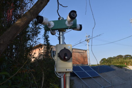 また、さきの監視カメラのポール(単管パイプ)を延長し、その上に風力発電を追加しました。ちなみに実は、以前に利用していたオフグリッド風力発電の使いまわしただけです(笑)。自宅に設置した時は全然回ってくれませんでしたが、畑の真ん中、それも海の近くなので風が強く、ここなら順調に発電してくれそうです。