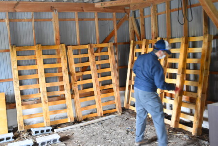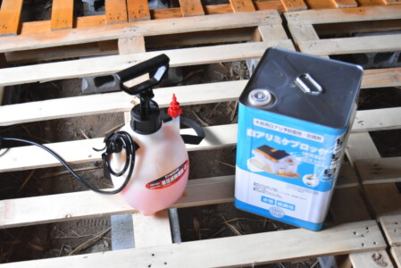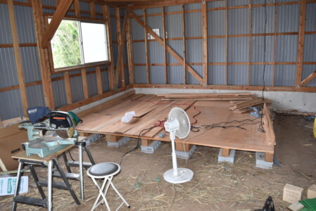 後ろのボロ倉庫ですが、中に床を作って事務所にする予定です(笑)。それも商用の太陽光パネルを設置した業者に「これ捨てるんですか? だったら欲しいです!!」とお願いして譲り受けたパレットを再利用してです(笑)。ただし木製パレットはシロアリが多いので、防虫剤をヌリヌリして、、、。って、水平とるの難しいんですね。実は、まだまだ未完成です。なので後日、完成したら報告致します。
