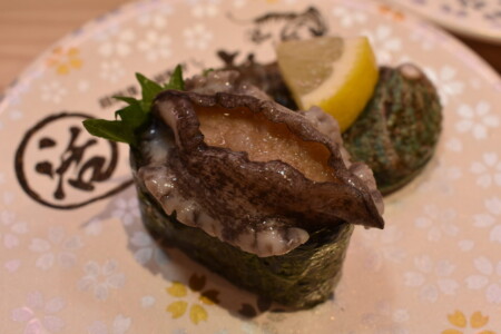 以前からこの噂は知っていたのですが、どこで食べれるのか判らず今まで食べたことがありませんでした。ですが友人から「北九州あわび」を開発した「丸福水産」が、小倉・旦過市場目の前に、廻転すし「活鮨の虎」をオープンし、そこで食べれると言う情報を聞きました。