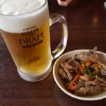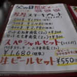 店内に入りメニューを見ると、おや「父の日限定メニュー」があるじゃないですか! 過去2回訪れた際は必ず定番の「チキン南蛮定食」を頼んでいたのですが、今回はせっかくなので限定メニューを頼みましょう。父の日限定メニューの「スペシャルセット(150gステーキ+ムネ身南蛮2個+ライス)」1680円と「生ビールセット(牛すじ煮込み付き)」550円を注文。相棒Kちゃんに「運転よろしくね♪」と頼むと「ま、父の日だからね」との返事。ありがと~(#^.^#)。その相棒Kちゃんは「ミックスプレート(チキン南蛮、エビフライ、ハンバーグ)」1320円を注文。運転してもらう代わりに、僕の「スペシャルセット」とKちゃんの「ミックスプレート」を交換する事にしました。僕はビールが飲めれば幸せなんです♪