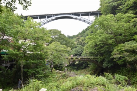 天翔大橋はアーチスパン260mでコンクリートのアーチ橋としては 日本一長い橋との事。五ヶ瀬川の水面から橋面までの高さも143mあり、 これも日本一高い橋となっているそうです。