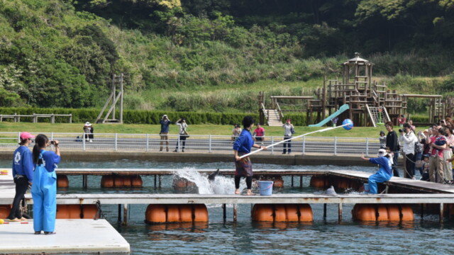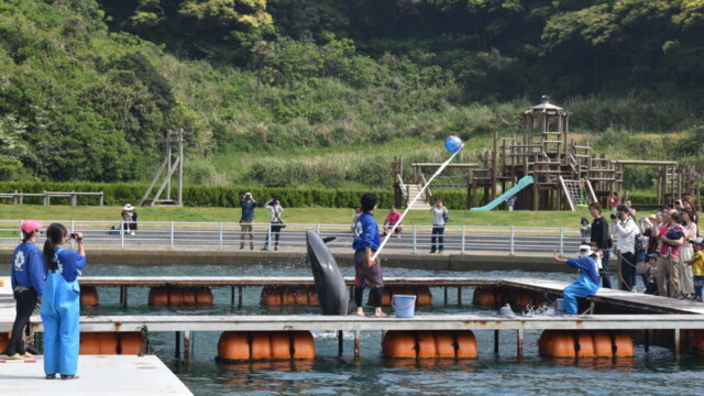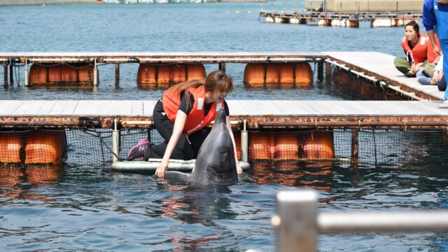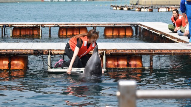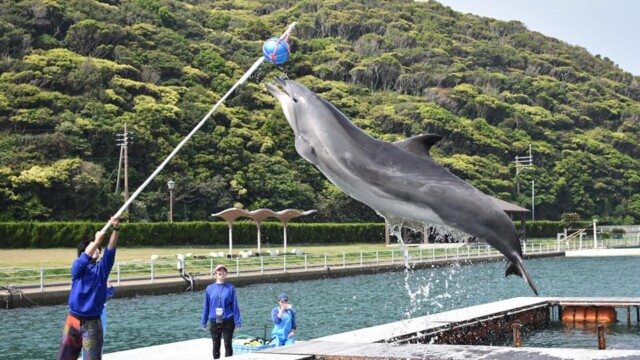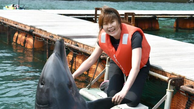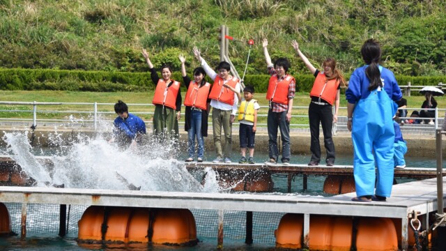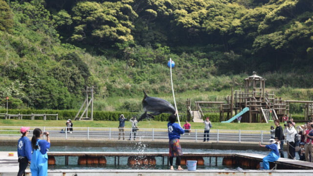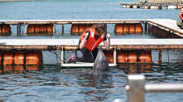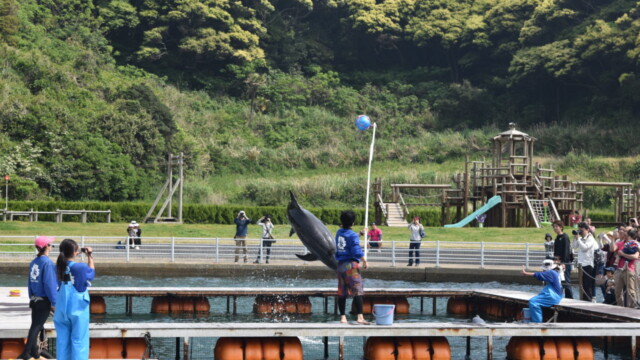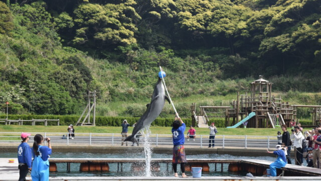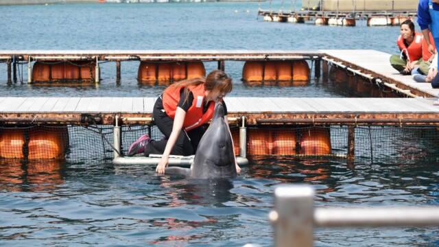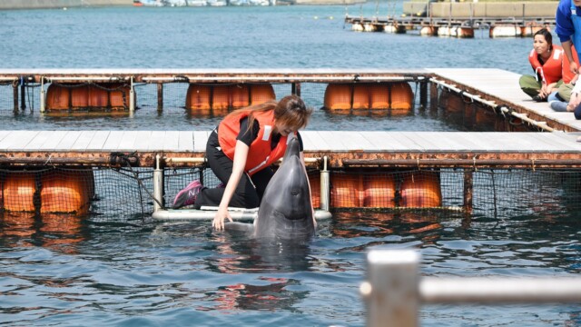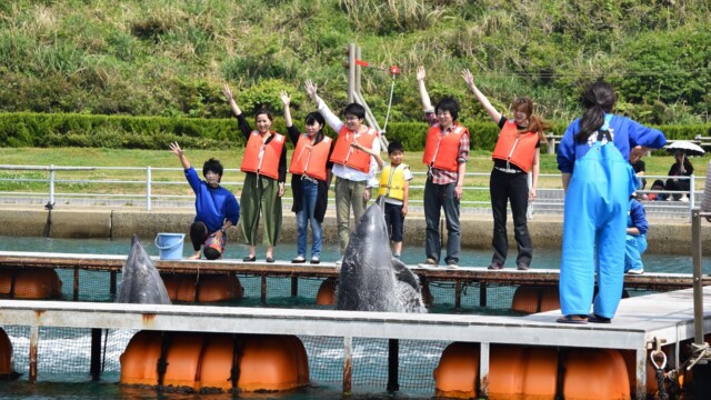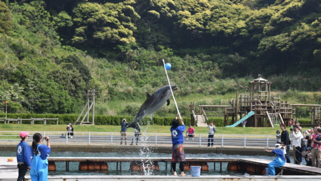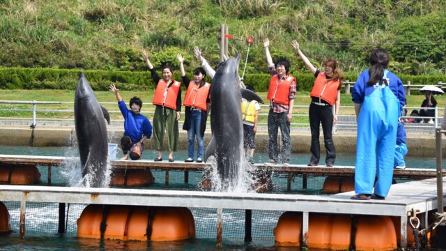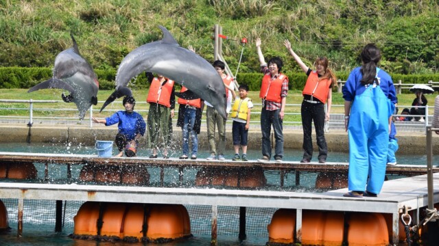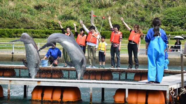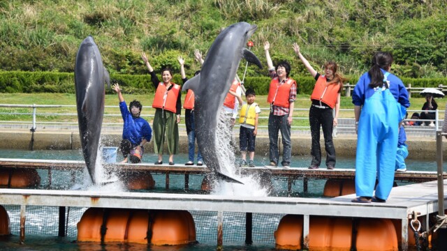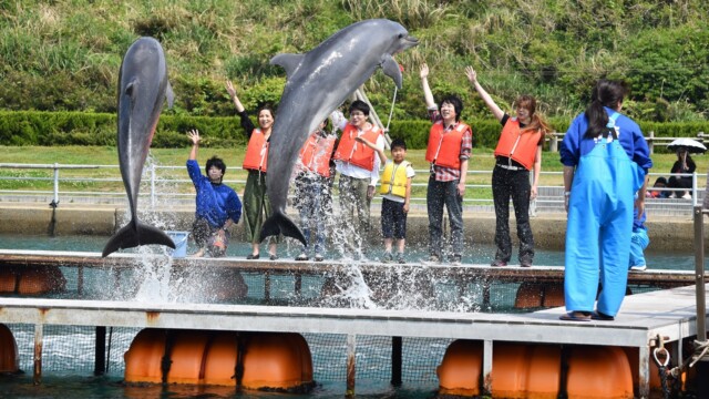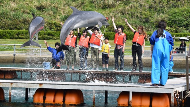 イルカのジャンプの瞬間イルカとの記念撮影の様子