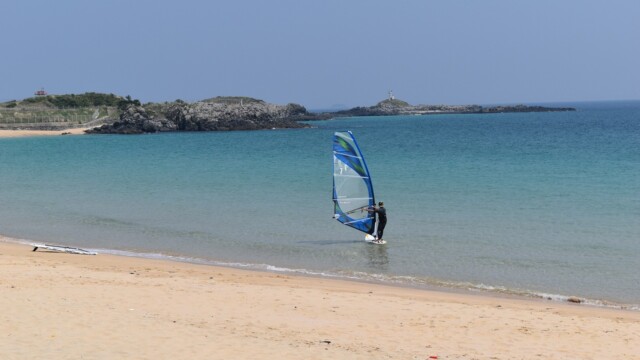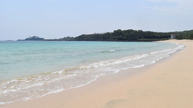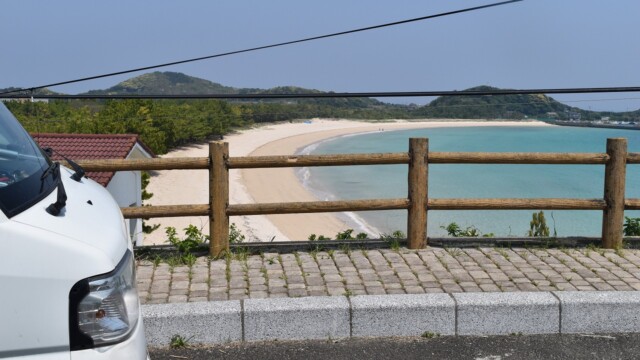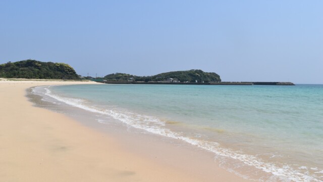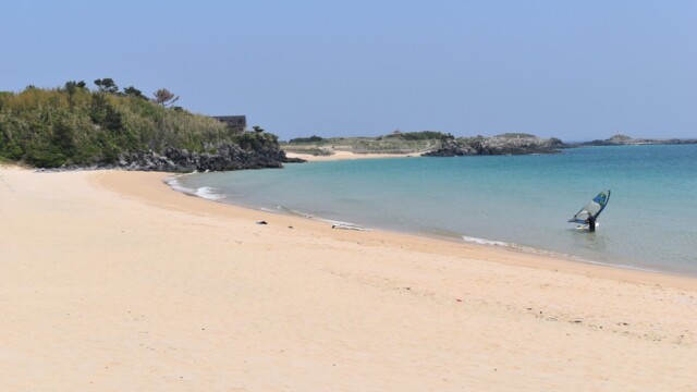 ここもキレイなビーチです。ウィンドサーフィンが気持ちよさそう。壱岐島には30ものビーチがあり、どのビーチも白い砂浜とサファイアやエメラルドグリーンのような宝石みたいな色の海が広がっています。