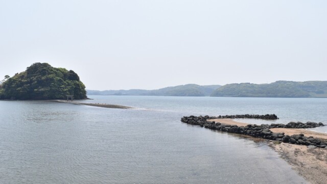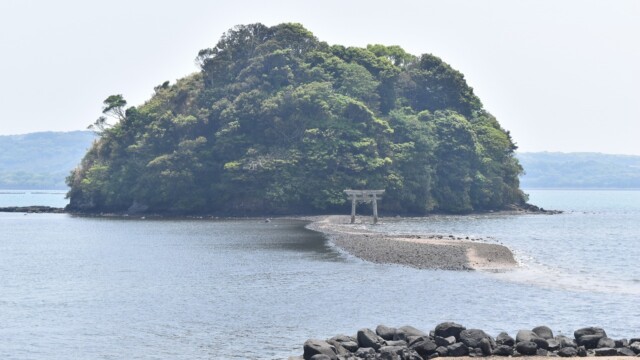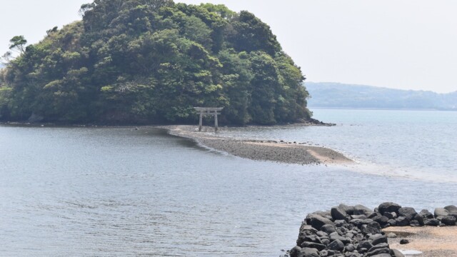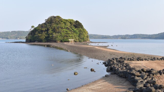 太陽と月の引力によって生じる干満によって、干潮時は海が割れて参道が現れ、満潮時は島に変わります。景観が美しくインスタ映えするスポット間違いありません。なお小島神社は小枝すら持ち帰ることが許されない島全体が神域とされている場所である点に御注意ください。