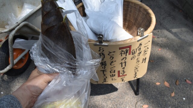 偶然、僕らが立ち寄った際にふるまわれていました。手と比べて頂けばお分かりになると思いますが、かなり大きな竹の子です。ネットに情報が上がっていなく毎年行われているかは解りません。だれか知っていたらお教えください。