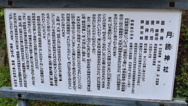 日本書紀の記述によると,古墳時代(西暦487年)阿閉臣事代あへのおみことしろという外交官が朝鮮半島の任那みなまに出掛ける途中,壱岐に立ち寄った際に月読尊が現われ「自分を京都に祀ればこの国に幸いが来る」と告げました。そのため 天皇に奏上して京都嵐山(現在の松尾神社の近く)に社を創建。壱岐の月讀神社の神を勧請して壱岐の県主あがたぬしの祖・忍見宿禰おしみのすくねに祀らせたそうです。 これが京都市の月読神社で,壱岐の月讀神社はその元宮とされている由縁です。この記述を基に、中央に神道が根付くきっかけが作られたとして,壱岐は「神道発祥の地」を名乗っているそうです。